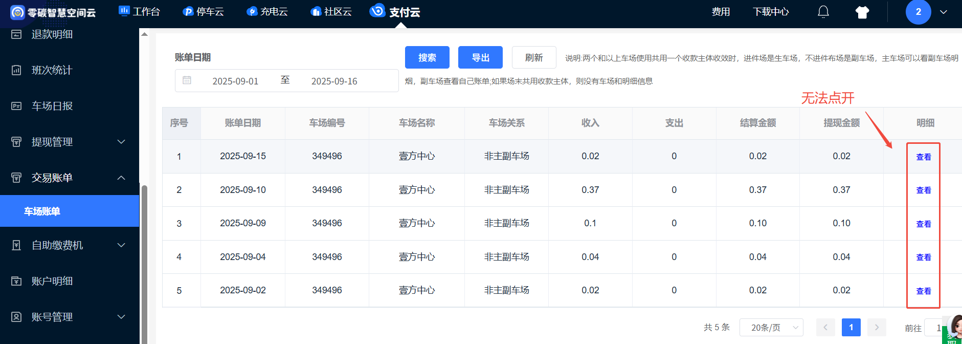 如下图:非主副车场无法点开查看,只有主副车场可以点开查看。  主副车场:车场使用的同一个进件主体资料,且同一个商户号收款。 主车场:A车场进件使用的主体资料被第一次使用,视为主车场; 副车场: B车场进件使用的主体资料被第二次使用,视为副车场; 非主副出场:每个车场使用的通一个主体资料,但是商户号不一样。 备注: 现在进件都是非主副车场 ;之前有一段时间是主副车场(已弃用该方案)。
