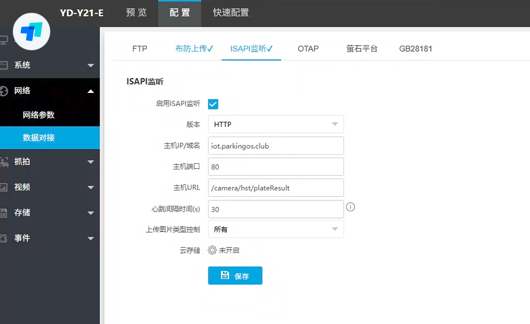 **启用ISAPI监听** 主机域名 ```xml iot.parkingos.club ``` 主机端口 ```xml 80 ``` 主机URL ```xml /camera/hst/plateResult ```  **设备注册** 心跳类型:comet轮询 上传URL ```xml /camera/hst/heartbeat ```